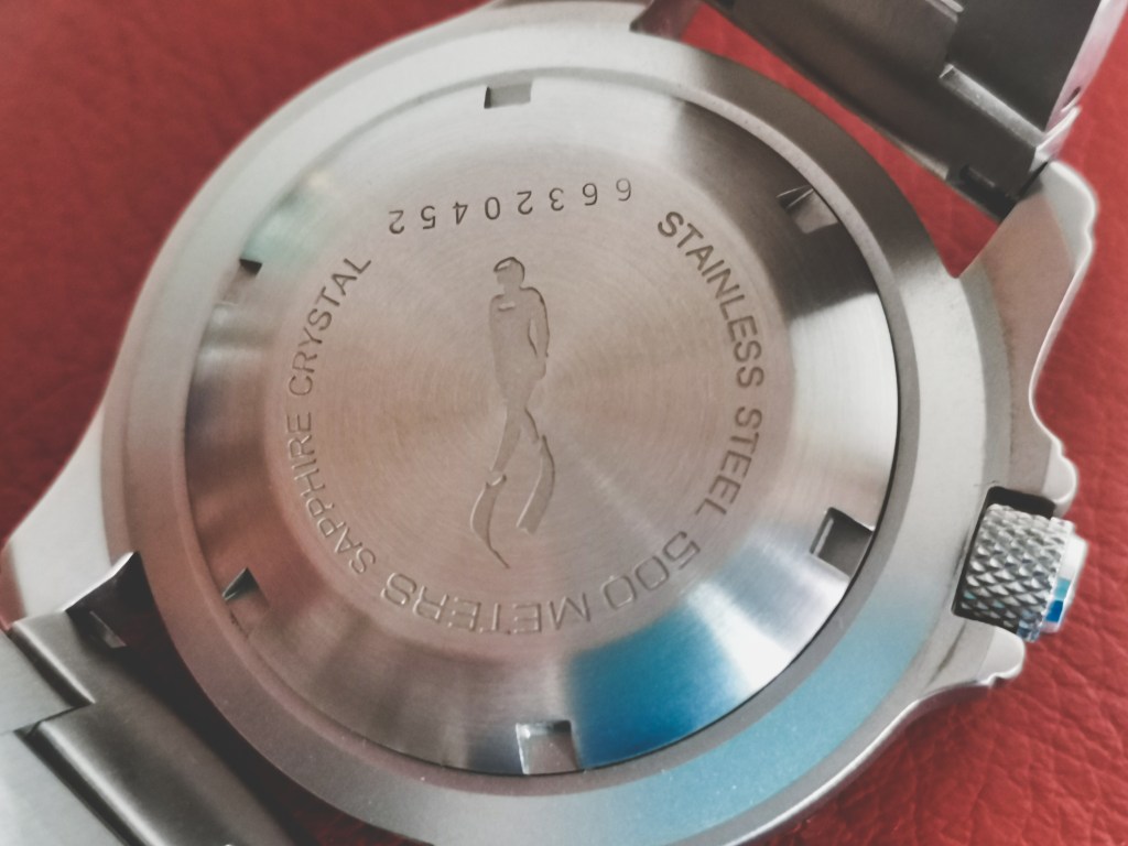 The case adopts a brushed finish throughout; nothing fancy, which is what you’d expect out of a tool watch anyway. The screw down case back offers a bit of decoration, featuring an image of a free diver.