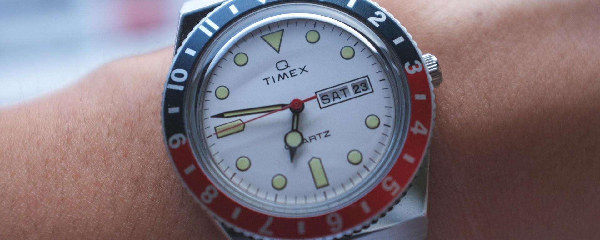 “Q Timex” and “QUARTZ” are printed below the 12 o’ clock marker and above the 6 o’ clock marker respectively, highlighting the Q Timex’s history.