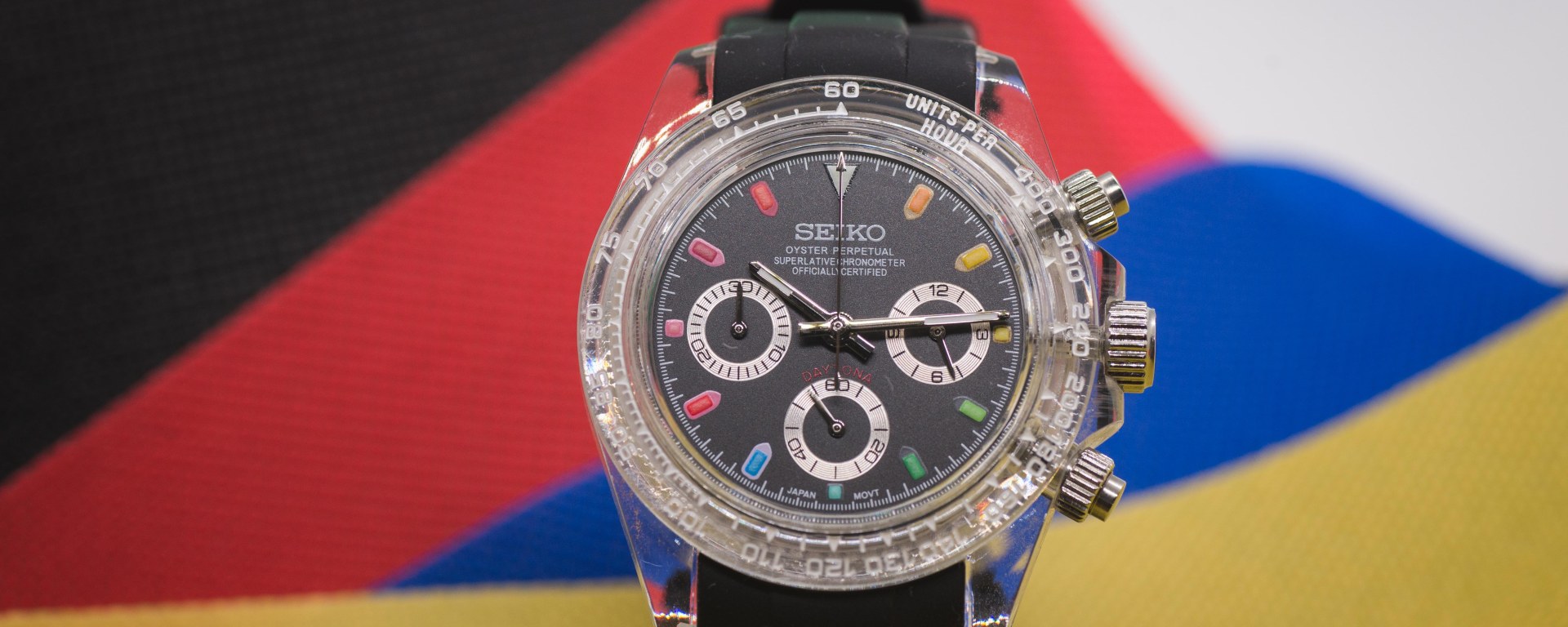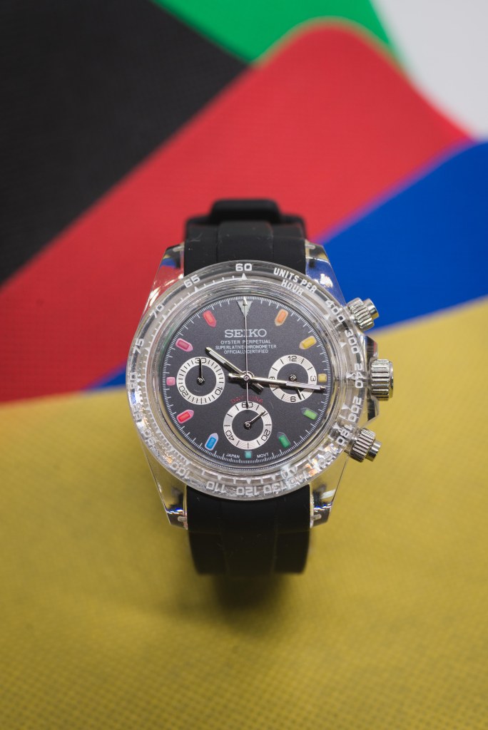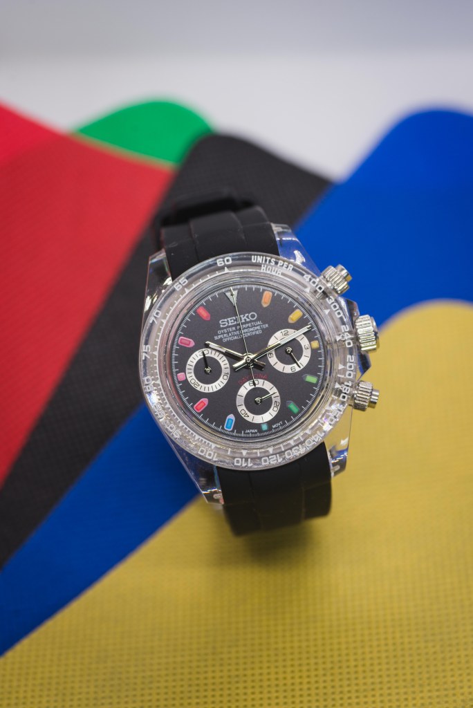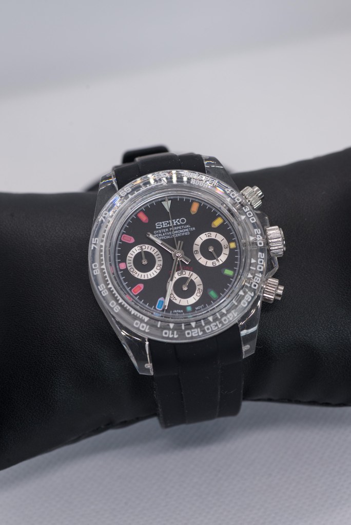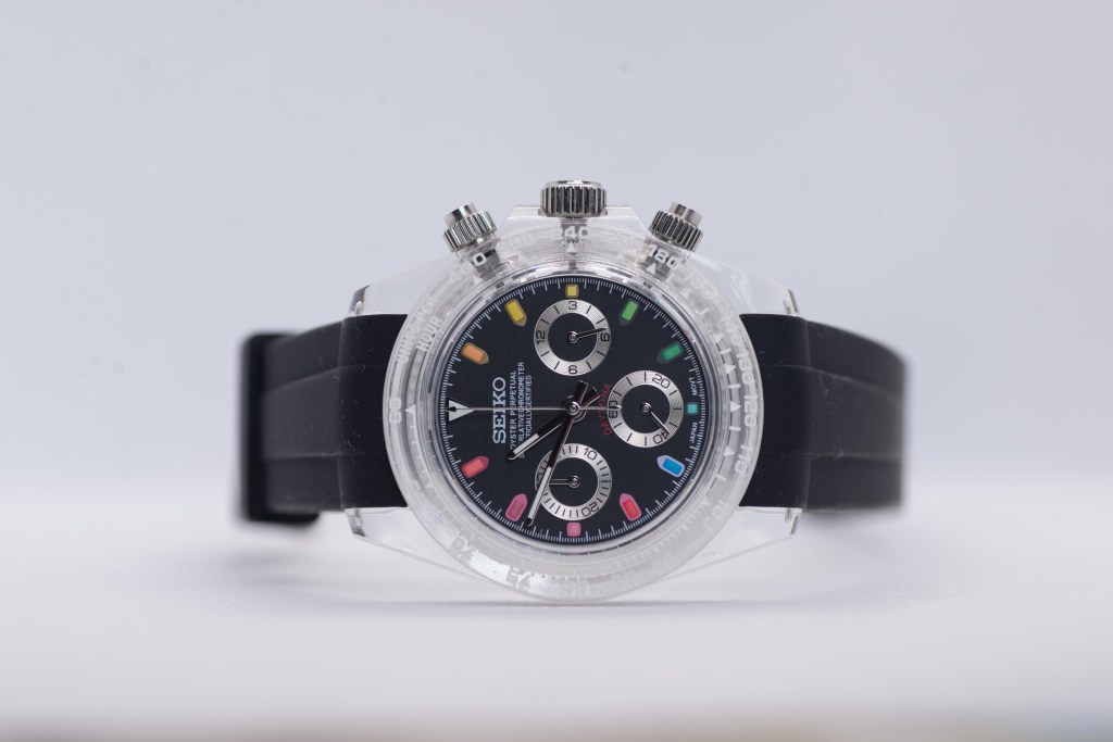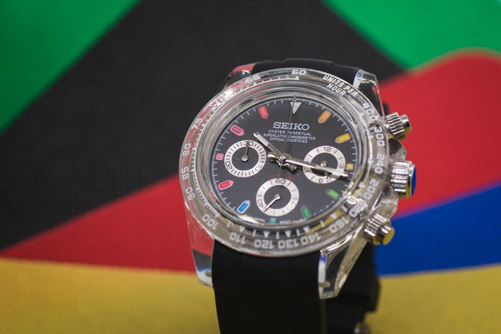 While I’m not entirely interested in that domain, I wanted to dip my toes into the water, and that brings us to today’s article – say hello to the Seiko Rainbow Daytona “Clear” Mod.