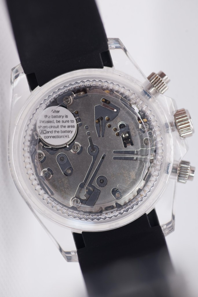 A key feature of the mod is the usage of a clear plastic case, allowing one to see into the watch from all angles aside from the dial. Granted, there isn’t really that much to look at here in terms of the movement (which at best, can be described as industrial in terms of decoration), but its still pretty cool. Legibility of the tachymeter bezel isn’t too great with white fonts on the transparent surface, but they’re there more to spice up the looks than anything else anyway.