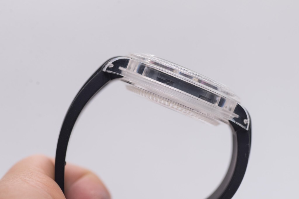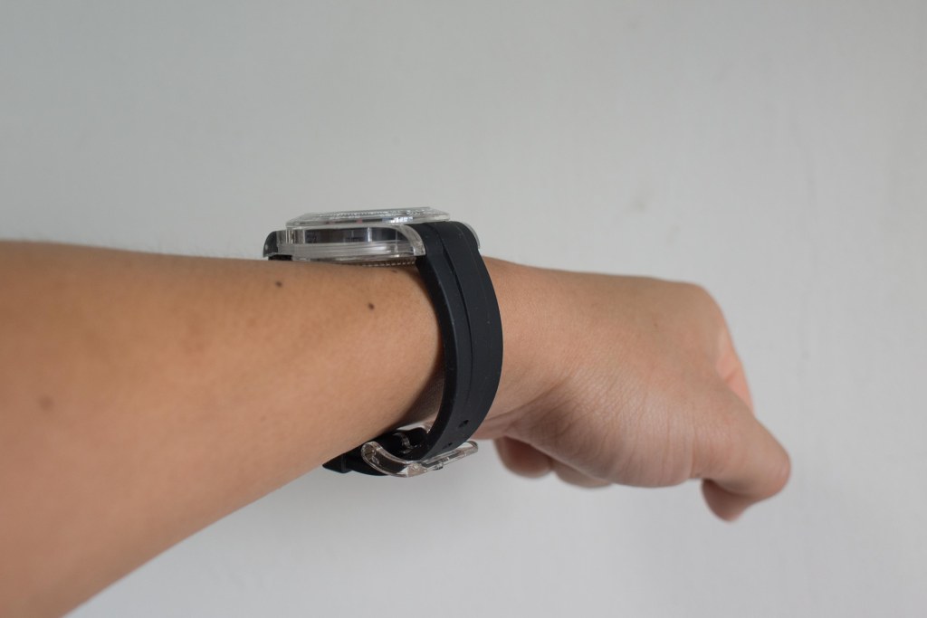 A fitted, curved end rubber strap came with the watch, together with accompanying clear hardware. It’s pretty much your generic rubber strap, and feels alright on wrist. Not much to shout about, but not much to complain either.