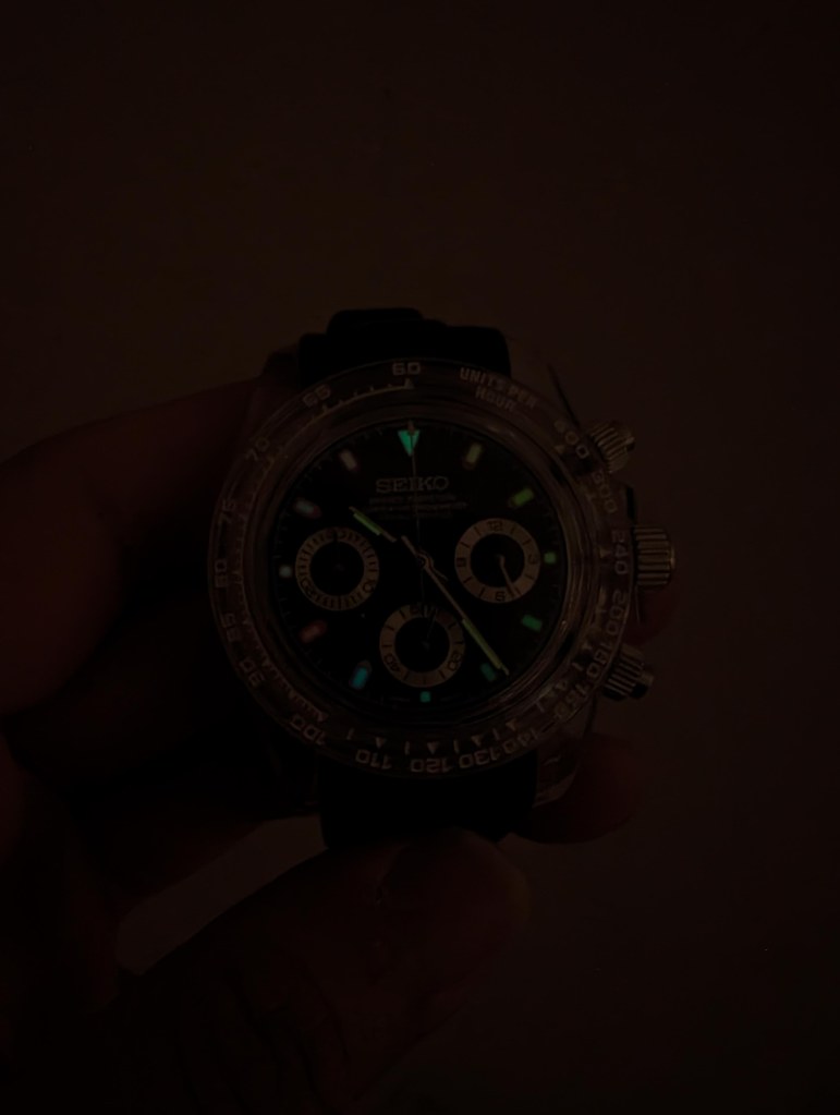 Before beginning, let’s address the elephant in the room: yes, it is evidently a homage to the Rolex Daytona; and you could argue about the distinction between a replica and a mod till the cows come home, but really that’s not for today. At a glance, you know this one isn’t actually a Daytona, and that’s mod enough for me.