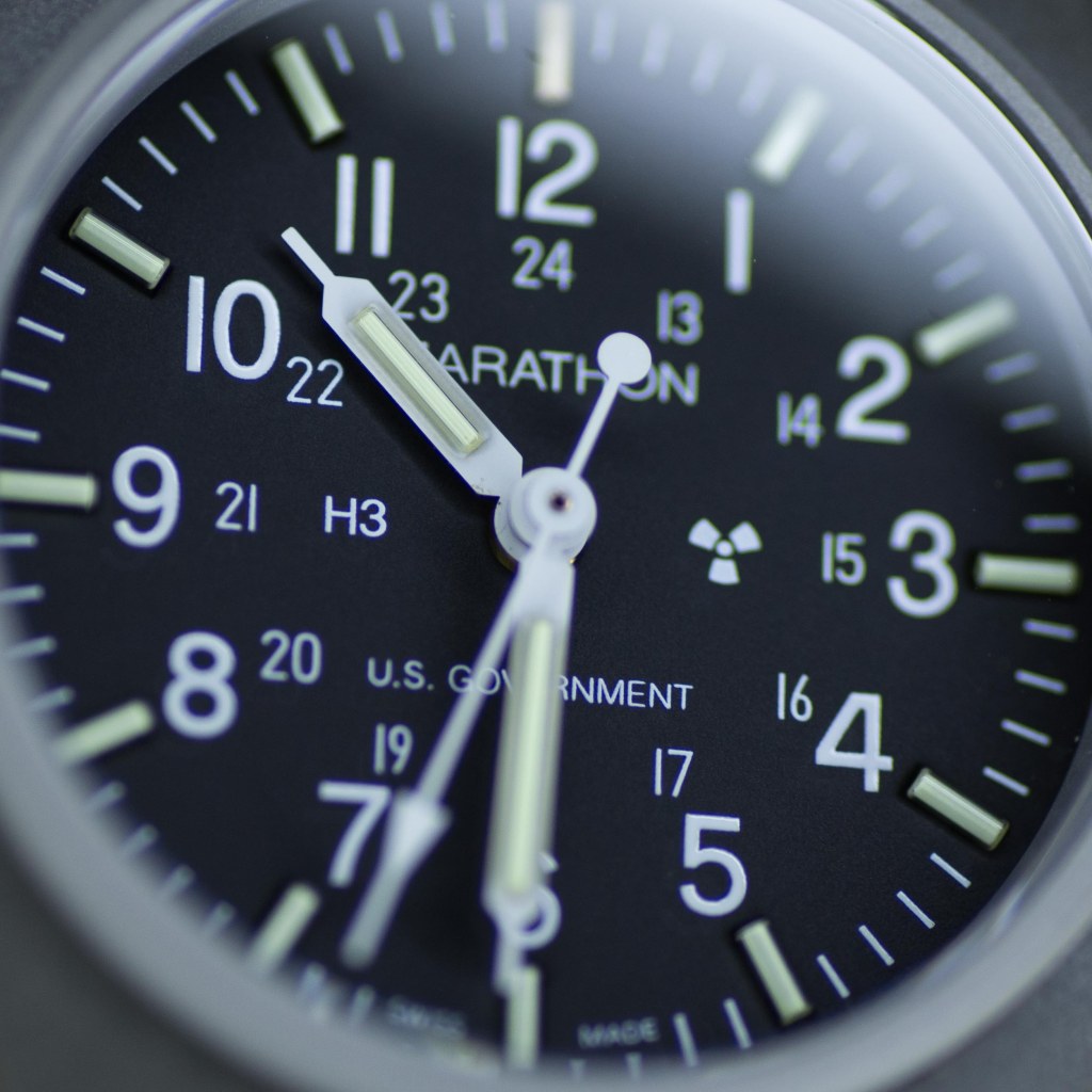 A quick glance at the GPQ will tell you that it means business. The dial comes in your standard no-nonsense field watch layout, with numerals 1-12 printed on the outside and 24HR time printed in smaller font on the inside. Above 6 o’clock, the words “U.S. GOVERNMENT” are printed, calling out to Marathon’s long standing status as the United States Armed Forces’ watch supplier. You can also opt for a sterile dial version or what Marathon refers to as “Standard Issue”, where the text “MARATHON” and “U.S. GOVERNMENT” are removed.