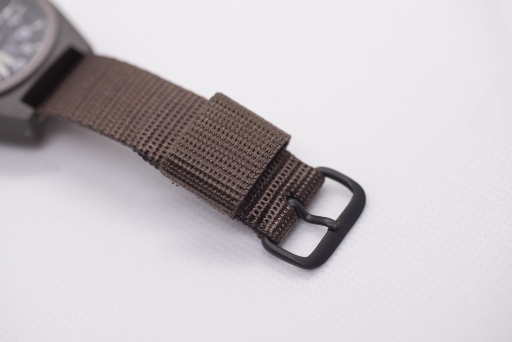With the fixed lugs, you’re hard pressed for options and you’ll probably keep it on the stock strap, which is of pretty good quality. It feels durable and strong, and I think it’ll last. The strap is in between an olive green and a khaki brown, and complements the case well. When buying the watch, you can opt for the Nylon DEFSTAN (defence standard) or the Ballistic Nylon (pictured here).