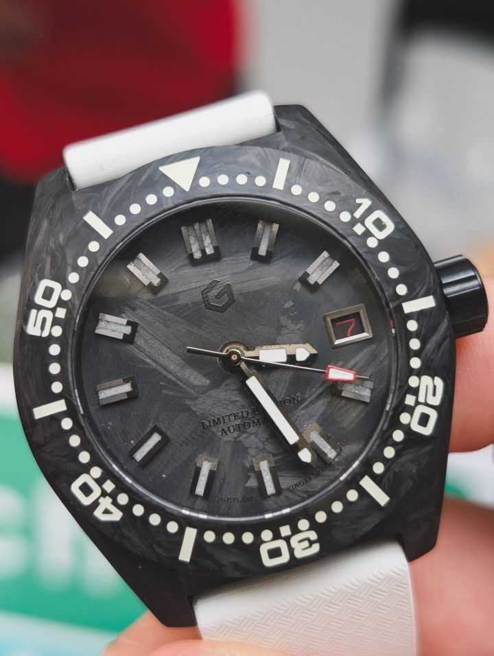 Coming back to the local scene, Geylang Watch Co impressed me with the Geylang Lorong 0 Carbon field watch, which had a matching carbon bracelet and was insanely light. Also on display was the Apex Hybrid Chronograph, with an interesting case shape that reminds me of Fear’s Brunswick collection. It gives me a retro-modern vibe, with vibrant pops of colour. There was also one other piece that seemed to be the brand’s interpretation of Seiko’s famous Grammar of Design, but I don’t think that’s been released publicly yet.